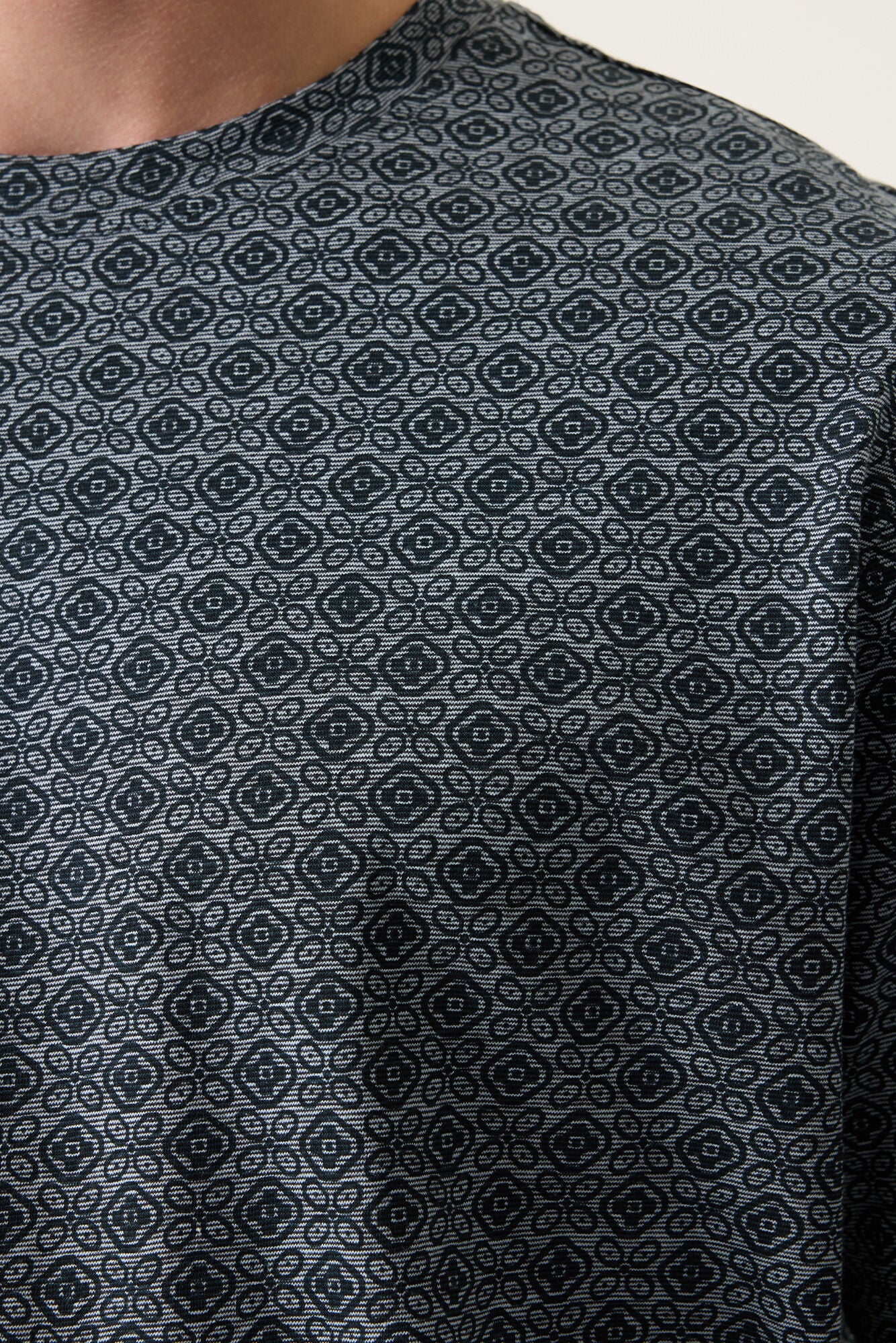 Camiseta versátil con estampado allover y cuello redondo que combina comodidad y responsabilidad ambiental.